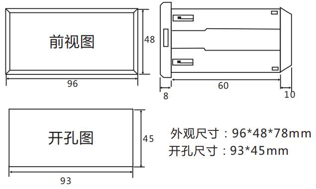 尺寸/安装 :盘面固定,外型(长)96X(高)48X(深)65mm;开孔尺寸93-0.5X45-0.5